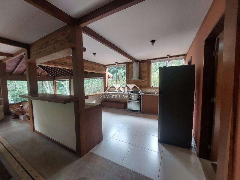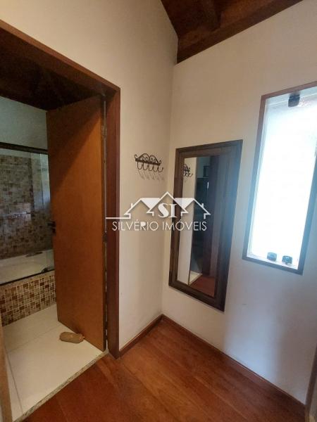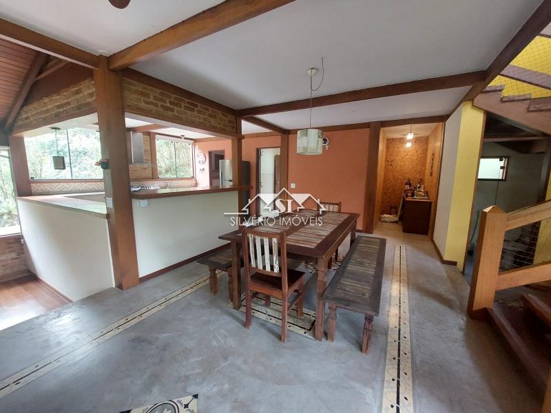 A casa principal, em dois andares ligados por escada muito confortável, é composta, no primeiro piso, por ótimo e amplo salão duplo em dois níveis com lareira, adega, duas varandas e espaçosa cozinha integrada e equipada, com despensa e área de serviço com máquina de lavar roupas (ambas com armários planejados), simpático lavabo e banheiro de serviço completo.